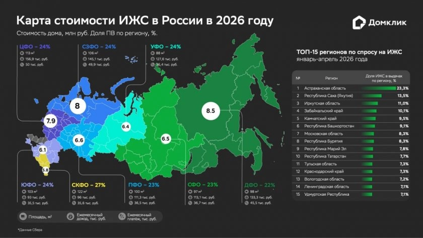 Самый высокий интерес к строительству собственного дома отмечен в Астраханской области. Там на ИЖС пришлось 23,3% от общего объёма выдач по региону с начала 2026 года. В тройке лидеров также Якутия (13,5%) и Иркутская область (11,0%).